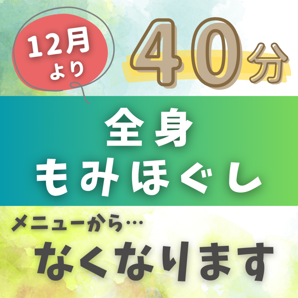 オープン当初から常備メニューだった【全身もみほぐし 40分】をメニューよりなくすことといたしました。